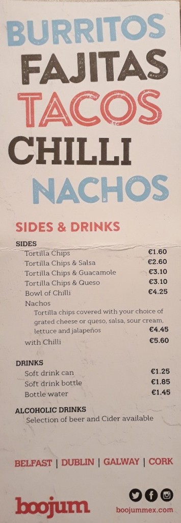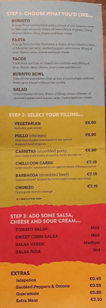 Ensuite, si le cœur vous en dit pour quelques centimes de plus, vous pouvez sélectionner des extras, comme des tortilla chips, un supplément viande, des rondelles de piments, du guacamole ou bien des poivrons et oignons sautés (si vous aviez choisi la base riz et haricots). Des boissons sont évidemment disponibles, et il y a de grandes tables si vous préférez manger sur place. Quatre adresses sont disponibles dans le centre de Dublin, et vous pourrez retrouver Boojum sur Deliveroo également !