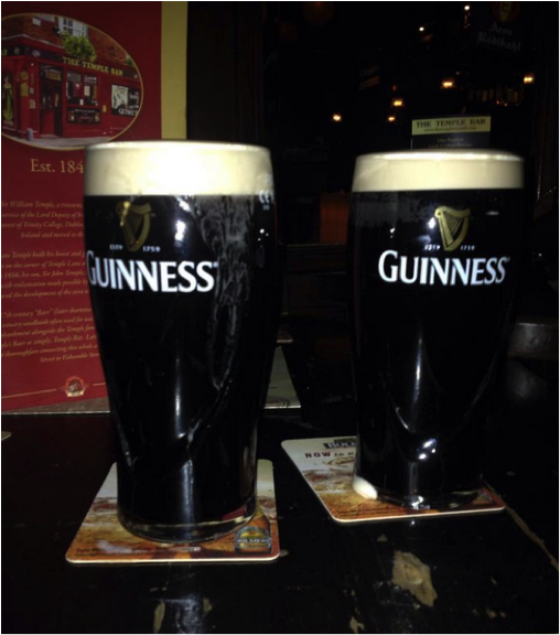 Alors quand j’ai su que je venais étudier un semestre à Dublin tous mes amis m’ont dit « Haha j’espère que tu aimes la Guinness et les roux ! », ça m’a un peu effrayée j’avoue. Donc, dès mon arrivée à Dublin, j’ai trainé ma sœur à Temple Bar pour essayer cette fameuse Guinness. Un autre ami [1] m’avait aussi dit qu’en calories, une pinte de Guinness était équivalente à un steak-frites [2] : j’espérais donc continuer à ne pas aimer.
