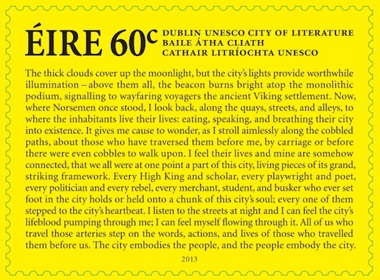 Pour célébrer la dimension littéraire de la capitale irlandaise, les autorités ont décidé de mettre une petite nouvelle sur un timbre de 60 centimes. Le texte en question est l’oeuvre d’un tout jeune auteur, qui a été sélectionnée dans le cadre de ce projet lancé en 2010.