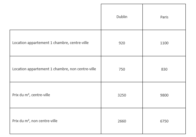 La location et surtout l’achat à Dublin est moins onéreux qu’à Paris.