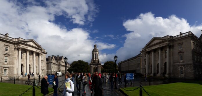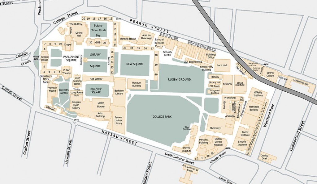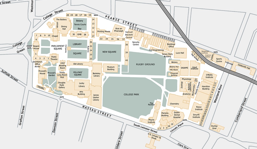 En plein centre de Dublin, le campus est à la fois un havre de paix et une ruche bourdonnante d’activité ! Franchissez les grandes portes de l’entrée principale et retrouvez-vous plongés en pleine vie étudiante. Elèves en retard, professeurs pressés, touristes égarés, les premiers mètres sont quelque peu étourdissants. Ne vous formalisez pas si l’on vous bouscule, le hall n’est pas très grand et les occupants de ce lieu très nombreux ! Mais passée cette arrivée, vous pourrez tranquillement reprendre vos esprits un peu plus loin, une fois le flot de personnes dissipé, face à la perspective que vous offre la place du parlement. Au bout d’une allée pavée, se dresse fièrement le campanile, bordé d’arbres et de constructions architecturales de siècles différents.