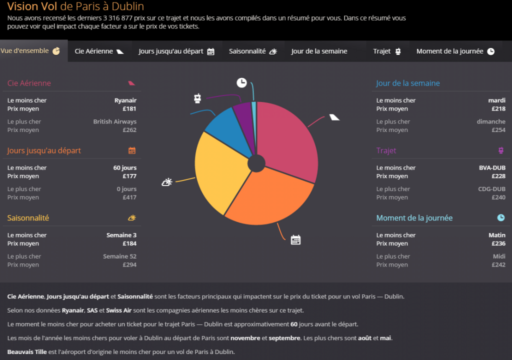 L’outil combine des millions de données sur les billets d’avion accumulées au cours des années. Ainsi, de façon très simple et en un clic, vous pouvez comparer les différents billets entre la France et l’Irlande pour trouver par exemple la compagnie aérienne la moins chère sur le trajet de votre choix, en partance de l’aéroport le moins cher, du meilleur moment de la journée pour trouver votre billet d’avion le moins cher et de la période de l’année la moins chère tout en ayant l’évolution du prix du billet au cours de l’année vous permettant aussi de vous organiser pour choisir le moment correspondant le plus à votre budget.