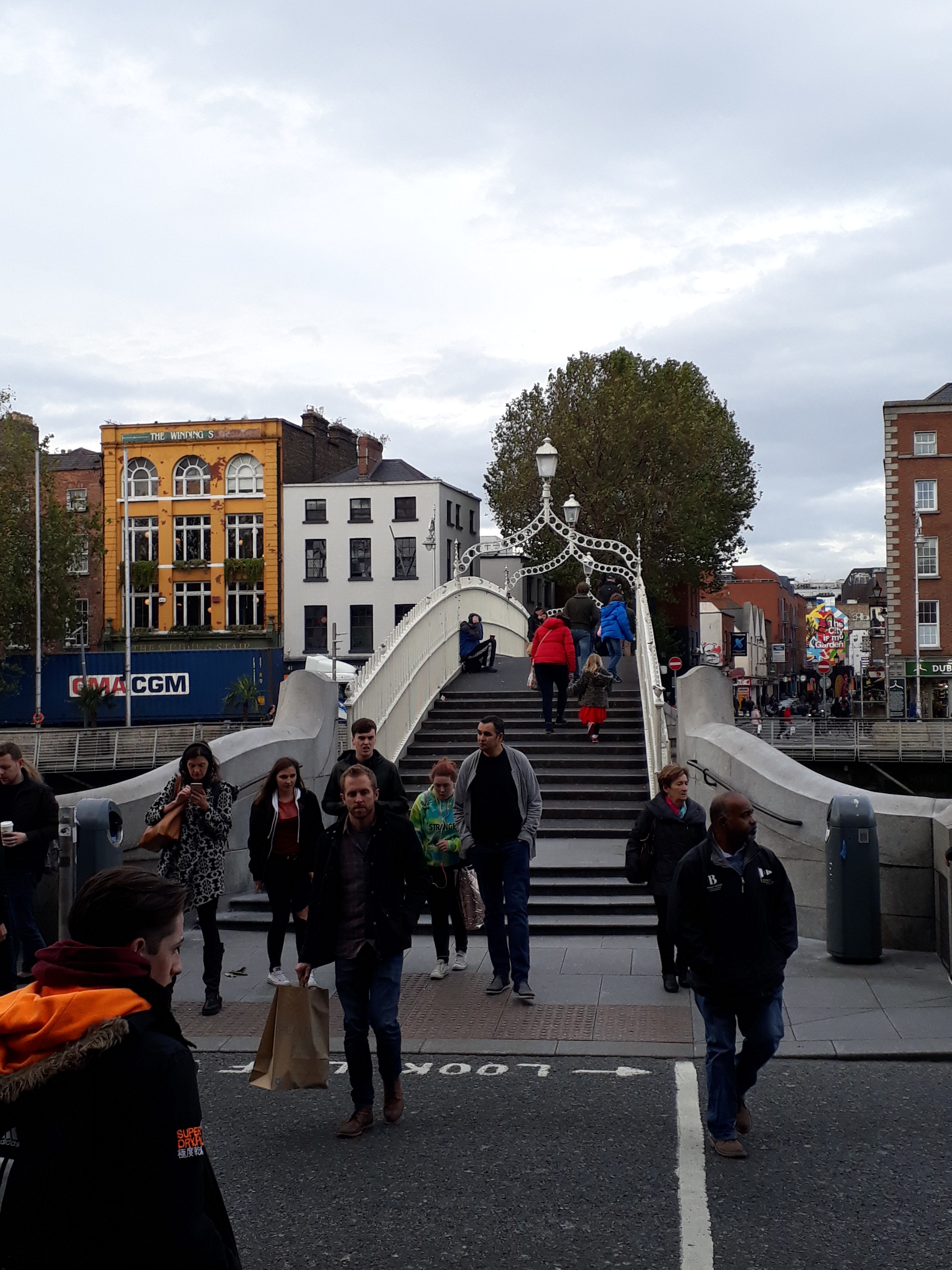 Revenez un peu sur vos pas, et traversez Dame Street. Sur le trottoir de droite (avec Trinity dans votre dos), vous arriverez bientôt à hauteur de l’Arbre Doré, une sculpture contemporaine qui peut valoir un rapide coup d’oeil. Prenez la rue à droite juste avant la sculpture et vous arriverez en plein Temple Bar ! Continuez tout droit, par une ruelle qui n’inspire pas confiance (mais qui est simplement étroite) et vous arriverez en face de la rivière Liffey, devant le Ha’penny Bridge. Ce nom étrange vient de la taxe qui était demandée pendant un siècle, un demi penny pour l’emprunter et traverser la rivière.
