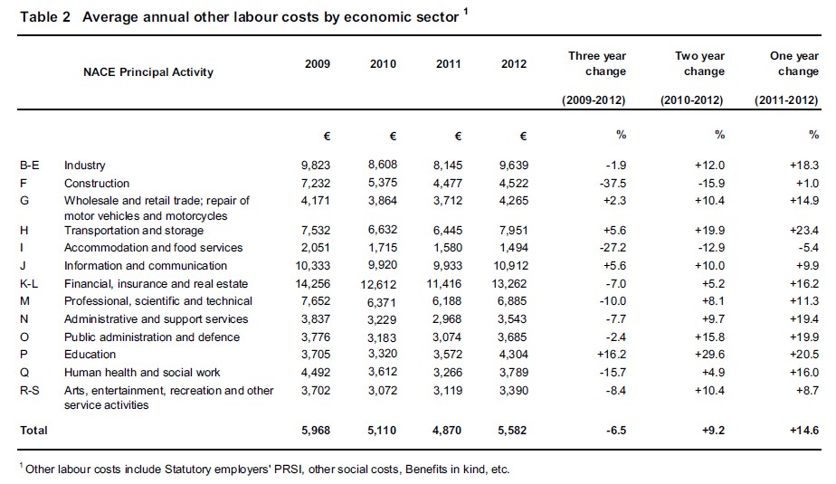Voici un tableau récapitulant les salaires selon le secteur où vous travailler. Ce tableau provient de l’institut statistique Irlandais (CSO). Je vous conseille de le prendre avec des pincettes, les salaires en plus du secteur dépendent aussi très souvent des structures où vous travaillez.