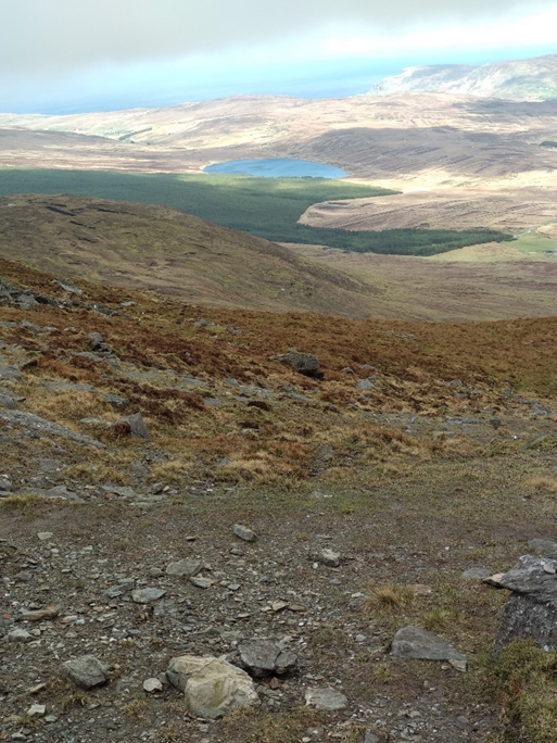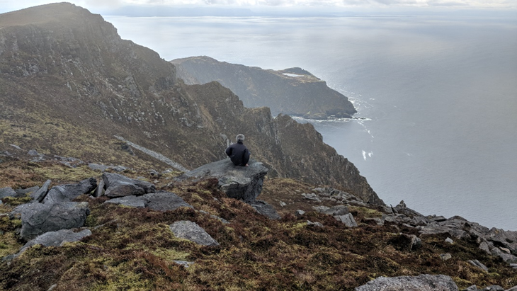 Nous avons mis environ 1h30 pour grimper et descendre la falaise à partir du second parking. La première étape du chemin est légèrement en pente, plutôt large mais couverte de grosses pierres. La seconde se fait par lacets afin d’adoucir l’effort de la montée. Elle alterne des parties rocheuses, de terre et de verdure. Des repères jaunes sur les roches permettent de s’orienter facilement. Le premier arrêt se fait après une demi-heure de marche et permet d’avoir une vue dégagée sur la vallée. La dernière halte, environ 15 minutes après, offre une magnifique vue sur la mer et lorsqu’on regarde vers le bas, on voit toute la beauté des découpes des falaises. Ce fut une belle découverte car Slieve League est un site sauvage et brut.